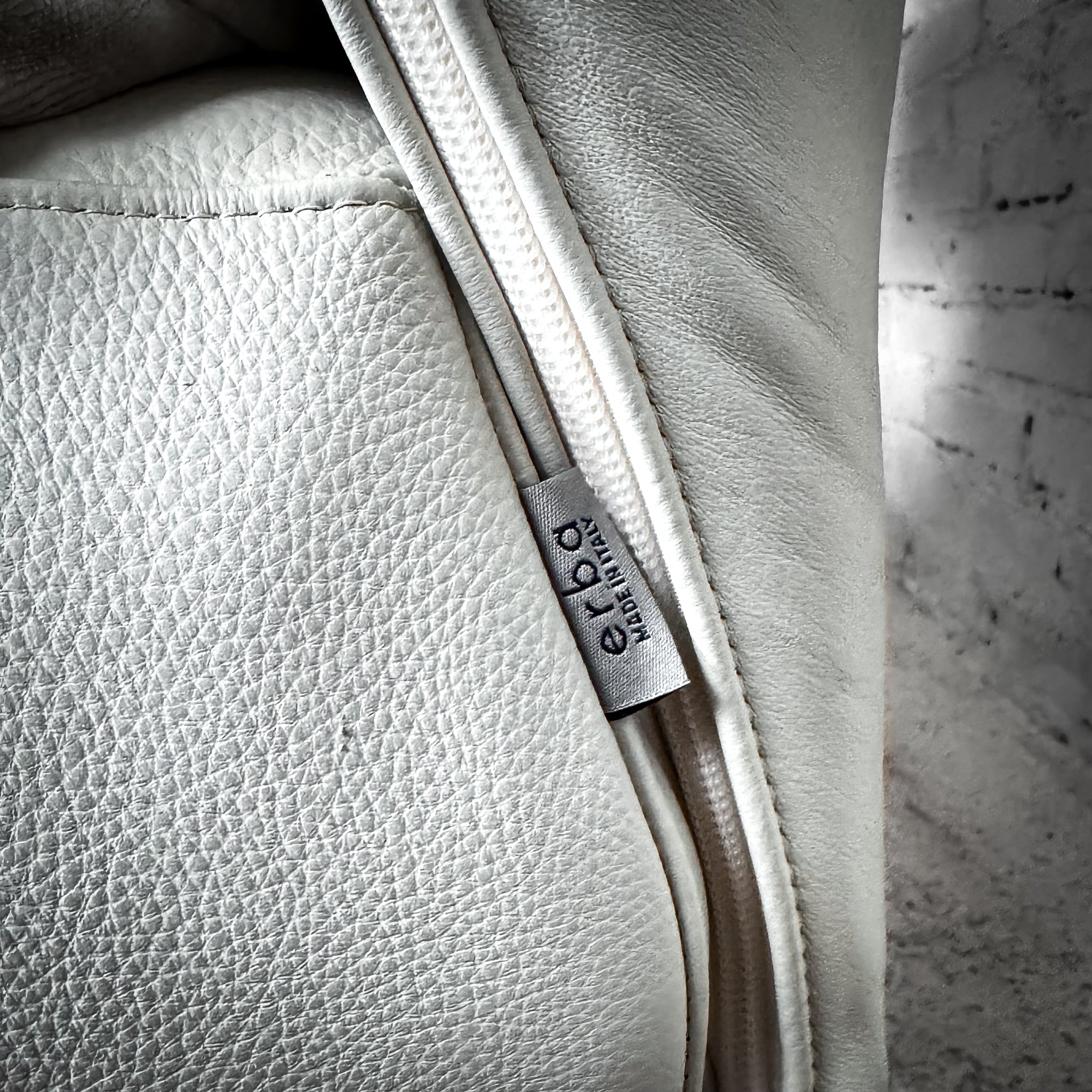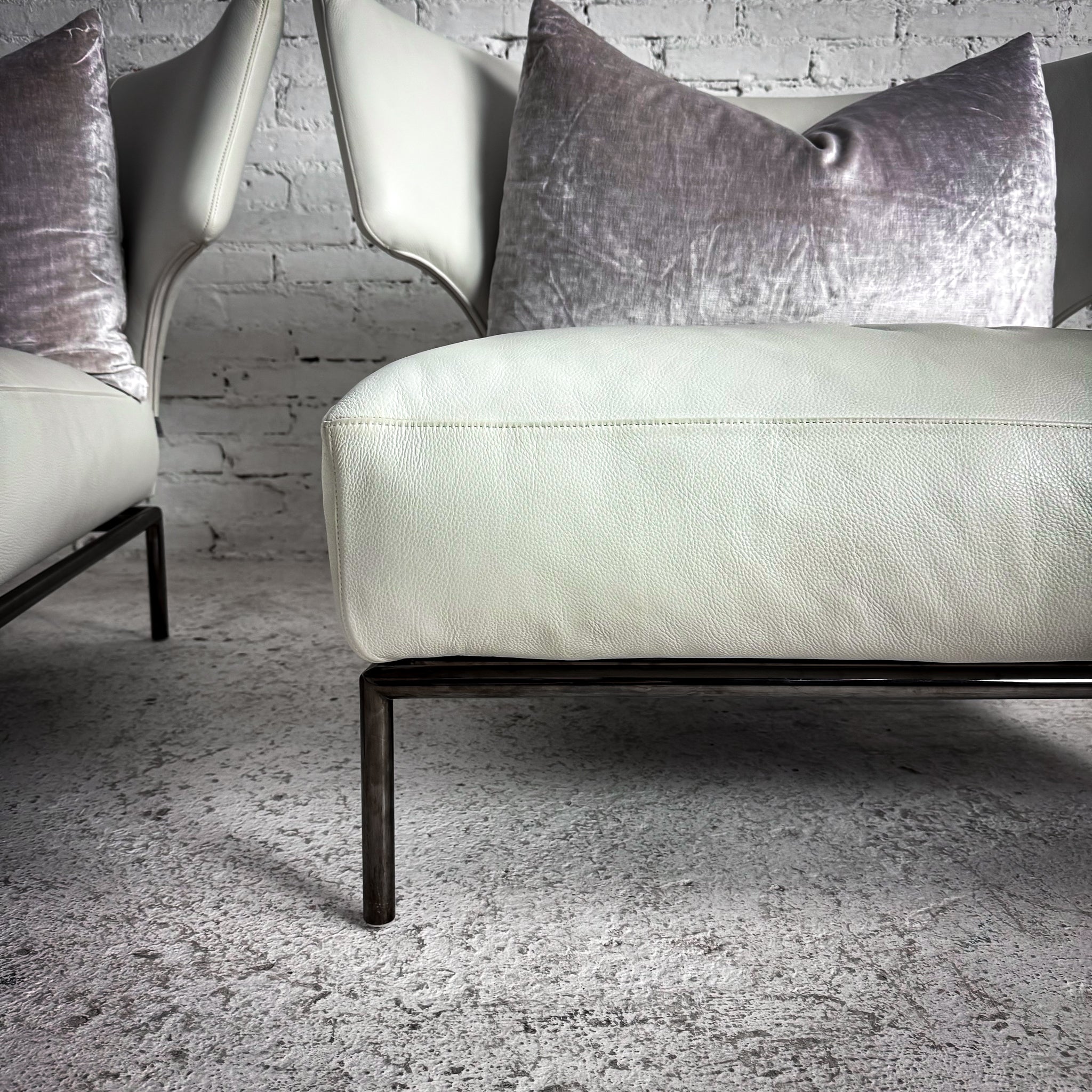 Lounge Chair, set of 2. Abbraccio chair by Giorgio Soressi for Erba (Italy) in white leather. Metal structure, seat springing system with elastic webbing. Base in tubular steel w/ galvanic treatment. Back cushion padded w/ feather fill. Minor staining.