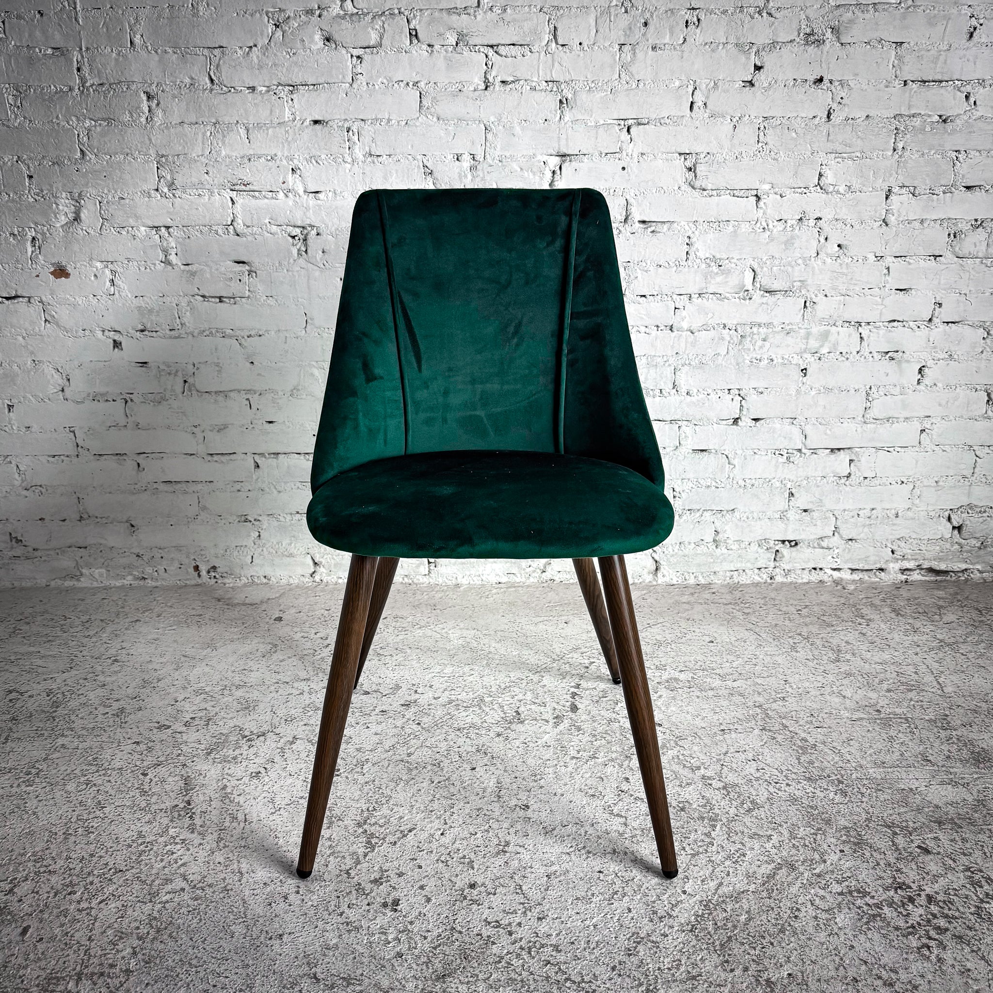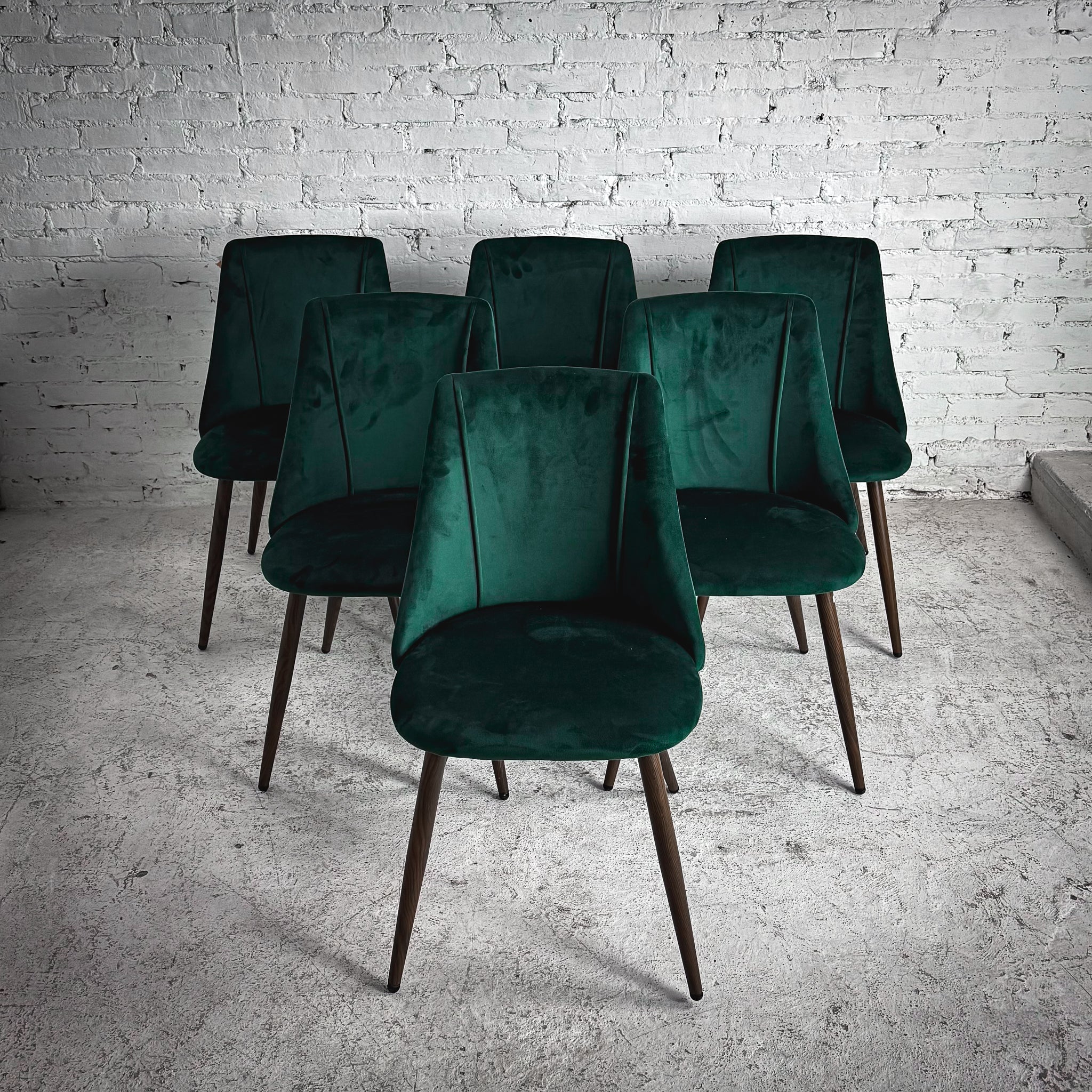 Dining Chair. Set of 6 green velvet dining chairs upholstered over foam padding, wrinkle-resistant and soft to the touch, supported by sturdy metal legs in a wood-tone finish; quick two-step assembly.