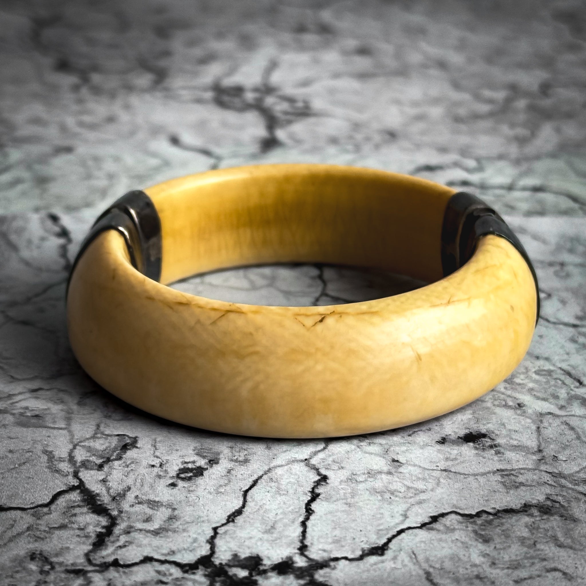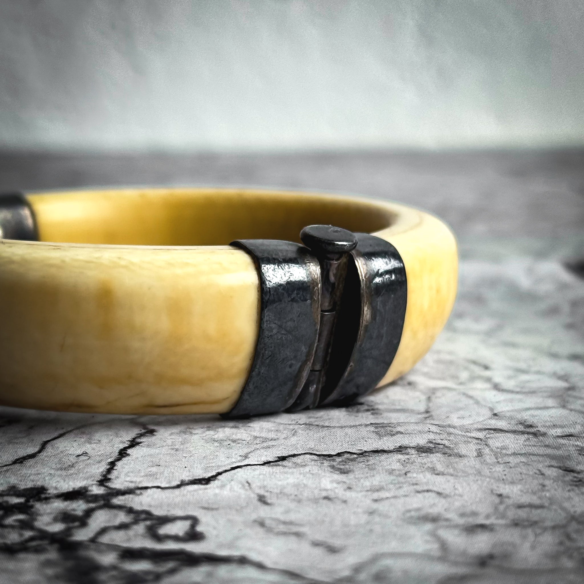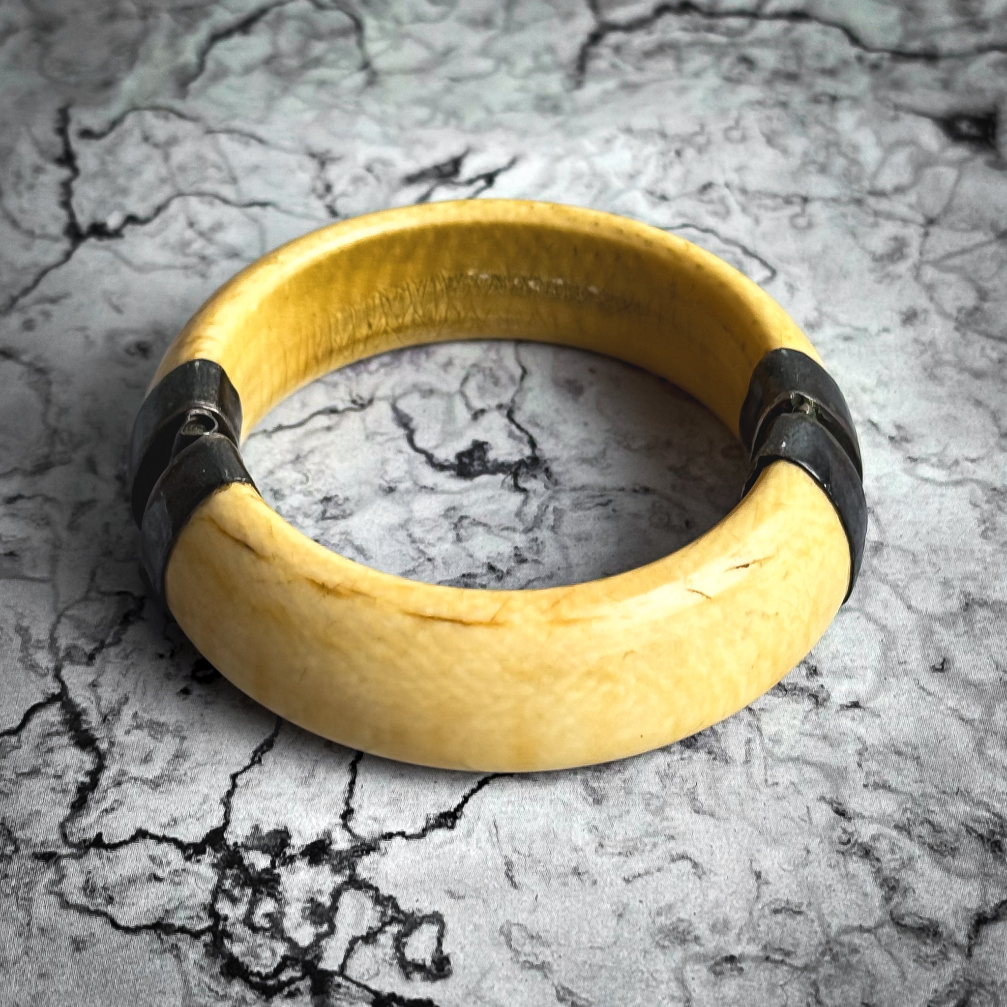 Banlge. Mid-century hinged bangle with aged bone or ivory body, oxidized metal mounts, and pin clasp, blending tribal and colonial design influences, c. 1940sā70s.