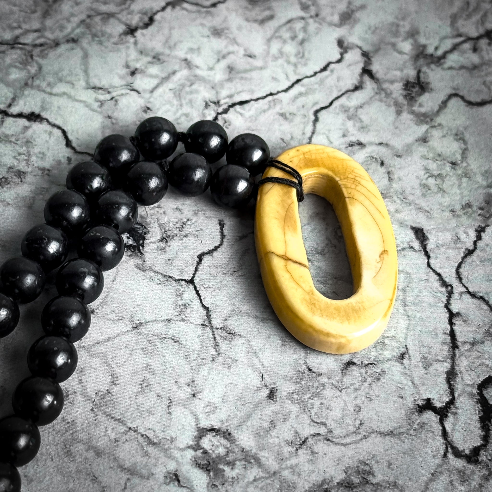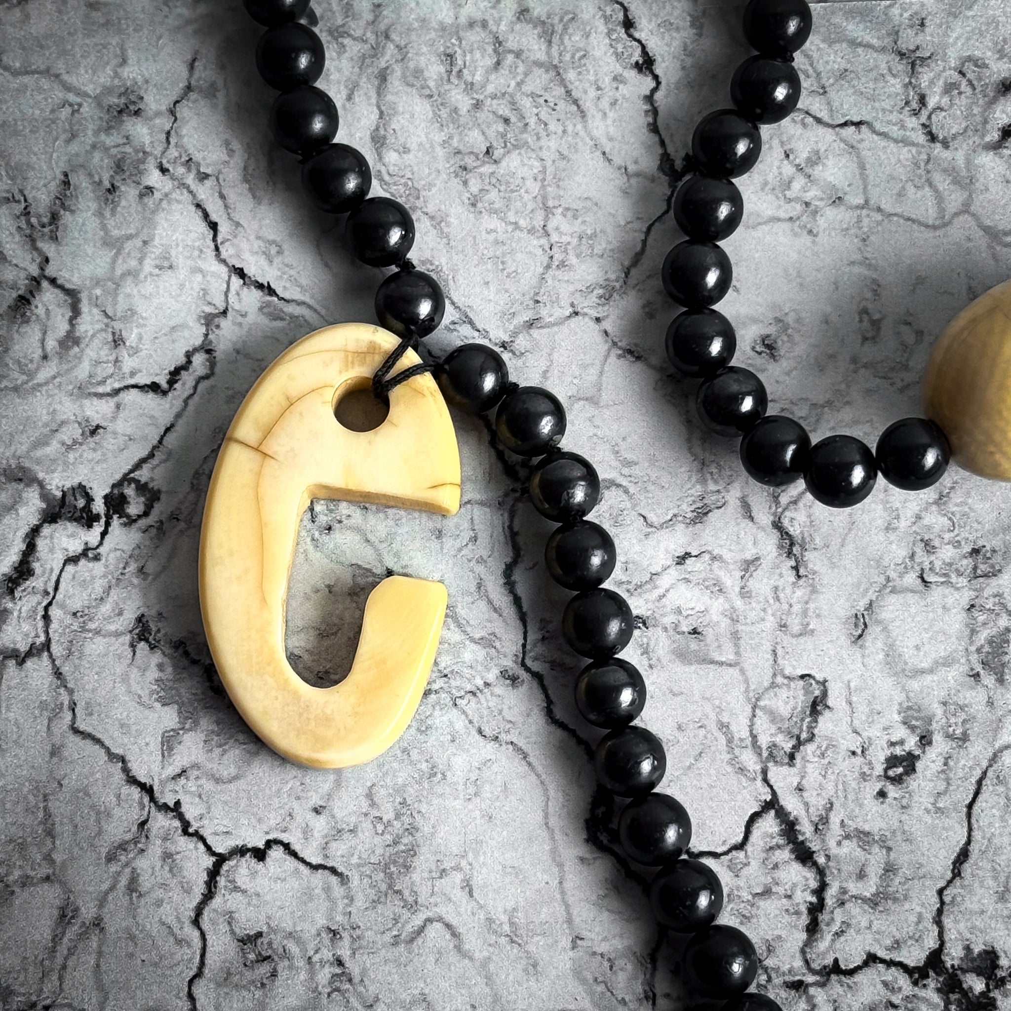 Necklace. Vintage tribal-style multi strand necklace with glossy black round beads and ivory-toned bone or tagua nut ovals, strung in bohemian naturalist style, c. 1950sā70s. Restrung.