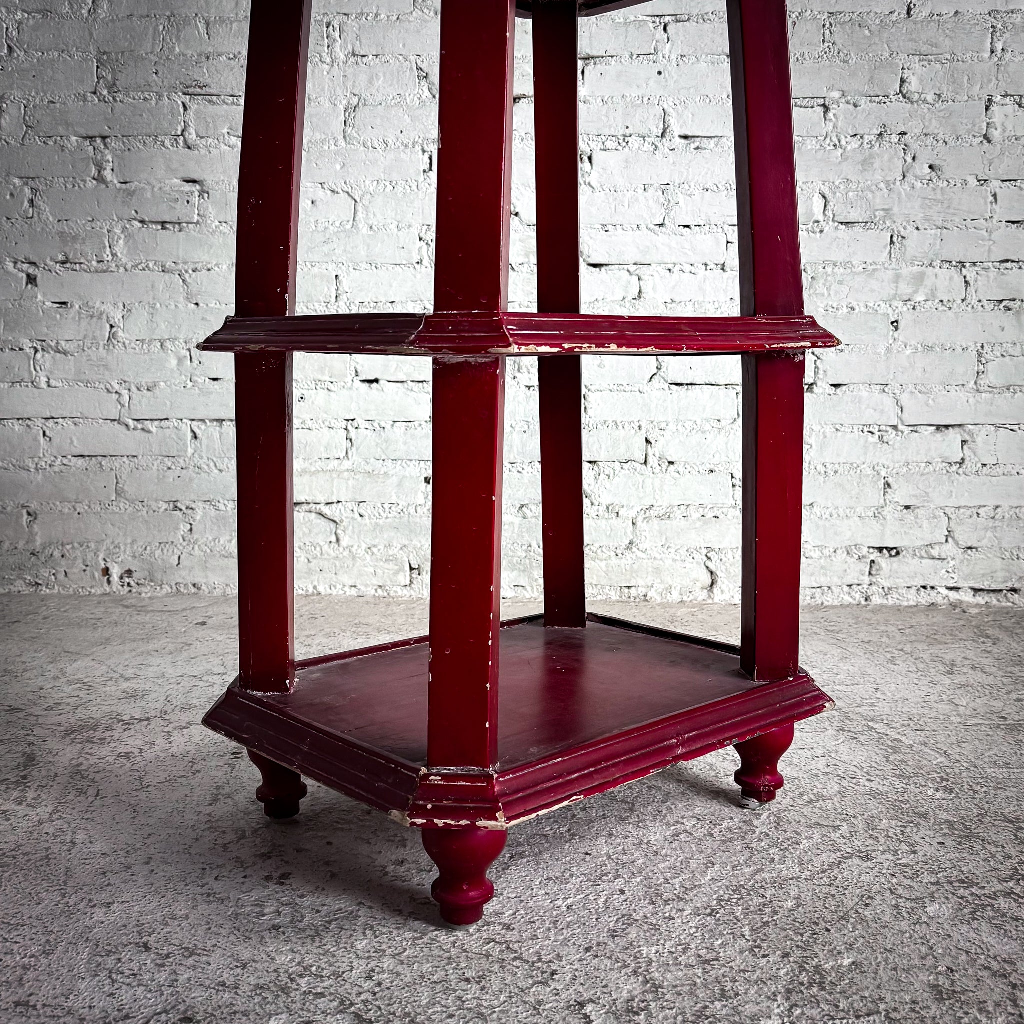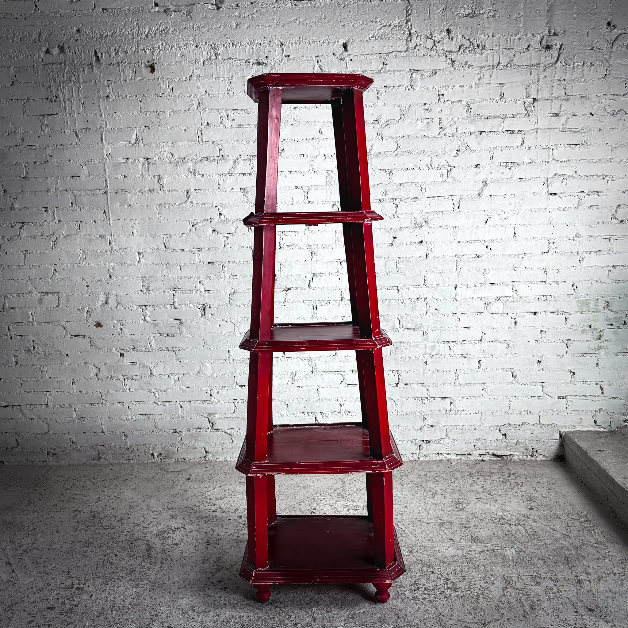 Shelving. Vintage Mexican red-painted étagères, four-tier hexagonal design with molded edges. Folk-style construction, worn lacquer finish, distressed and decorative. 2 availble at time